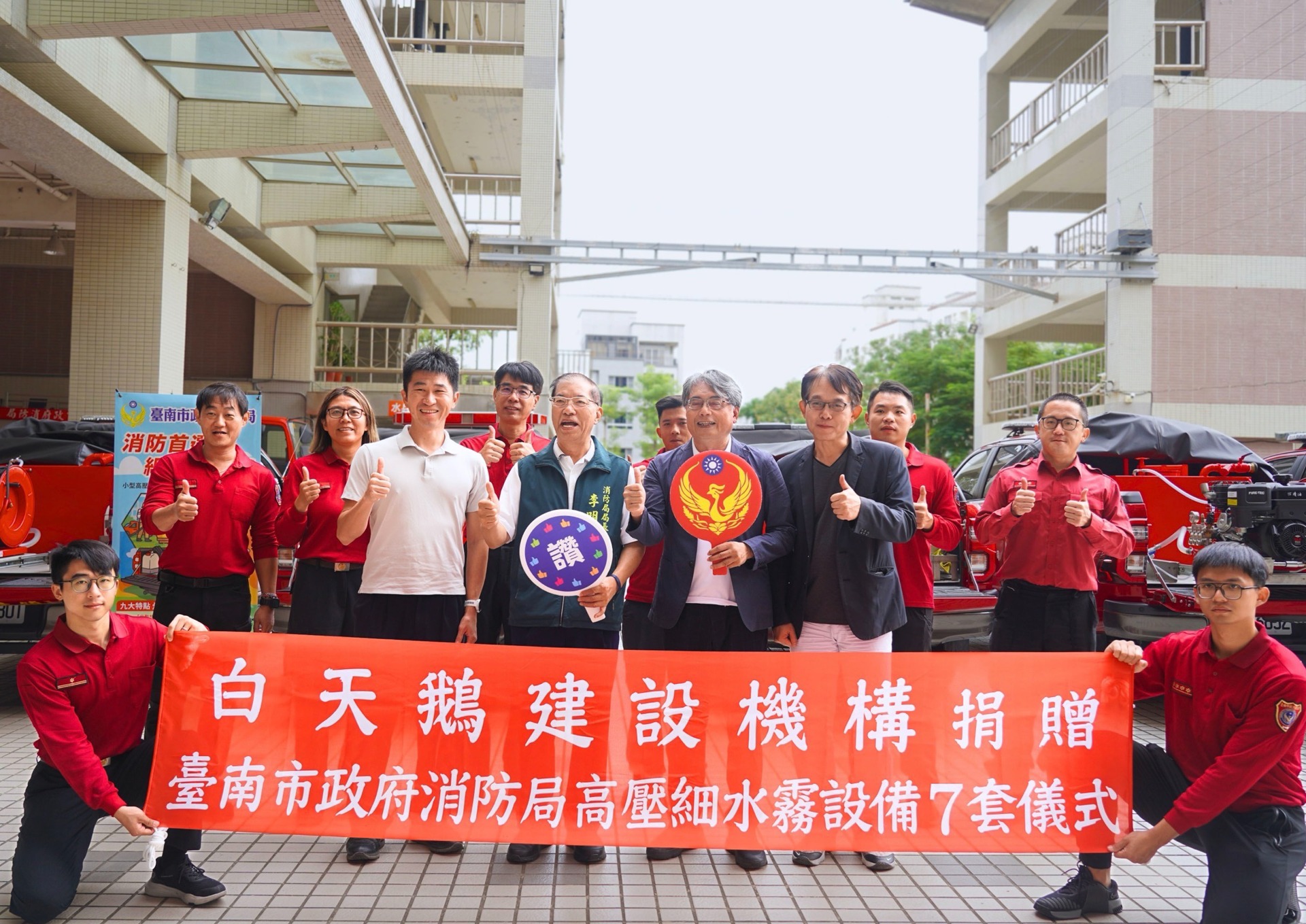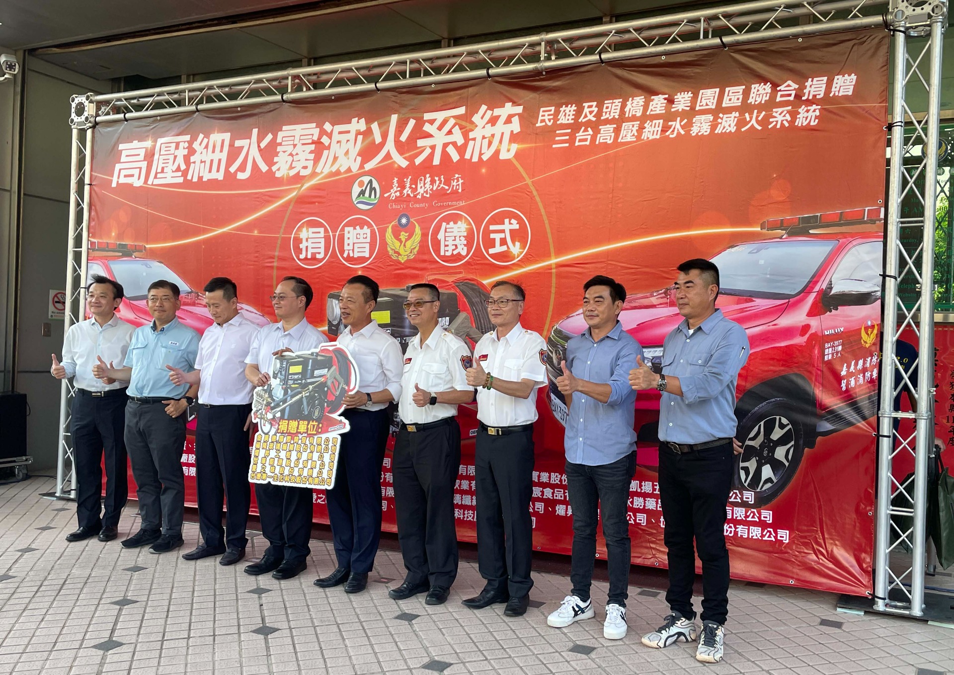 3家企業均為台南市在地頗負盛名的建築企業,其建築作品深獲民眾青睞,長期耕耘地方奉獻社會不遺餘力,所捐贈之高壓細水霧設備,為台南市消防局首創,將現有的災情勘查皮卡車安裝上專門提供給機動車輛使用之高壓細水霧設備,使車輛功能更多元。這套設備自研發迄今已歷時2年多,深獲外勤同仁一致肯定,並持續召集產業界、學術界及國內火災搶救專家提供寶貴意見精進設計,讓使用更得心應手,大幅提升救災效率。